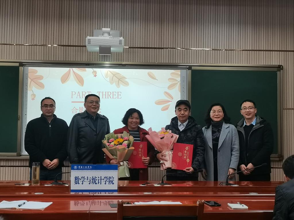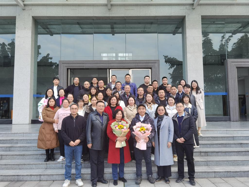 最后,公司经理熊江、党总支书记黄明靖为两位老师赠送鲜花、颁发荣退证书,与会人员合影留念。