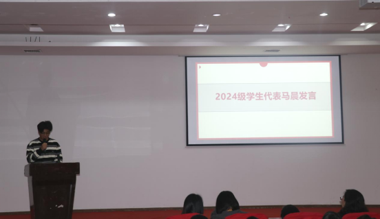 2024级马晨同学代表全体新生表达了对老员工活未来的期待与展望,表示将以“优良学风班”创建为契机,培养自律能力和自主学习意识,养成良好学习习惯,不断提升学习效率和专业素养,努力成长成才,做能担重任的新时代青年。