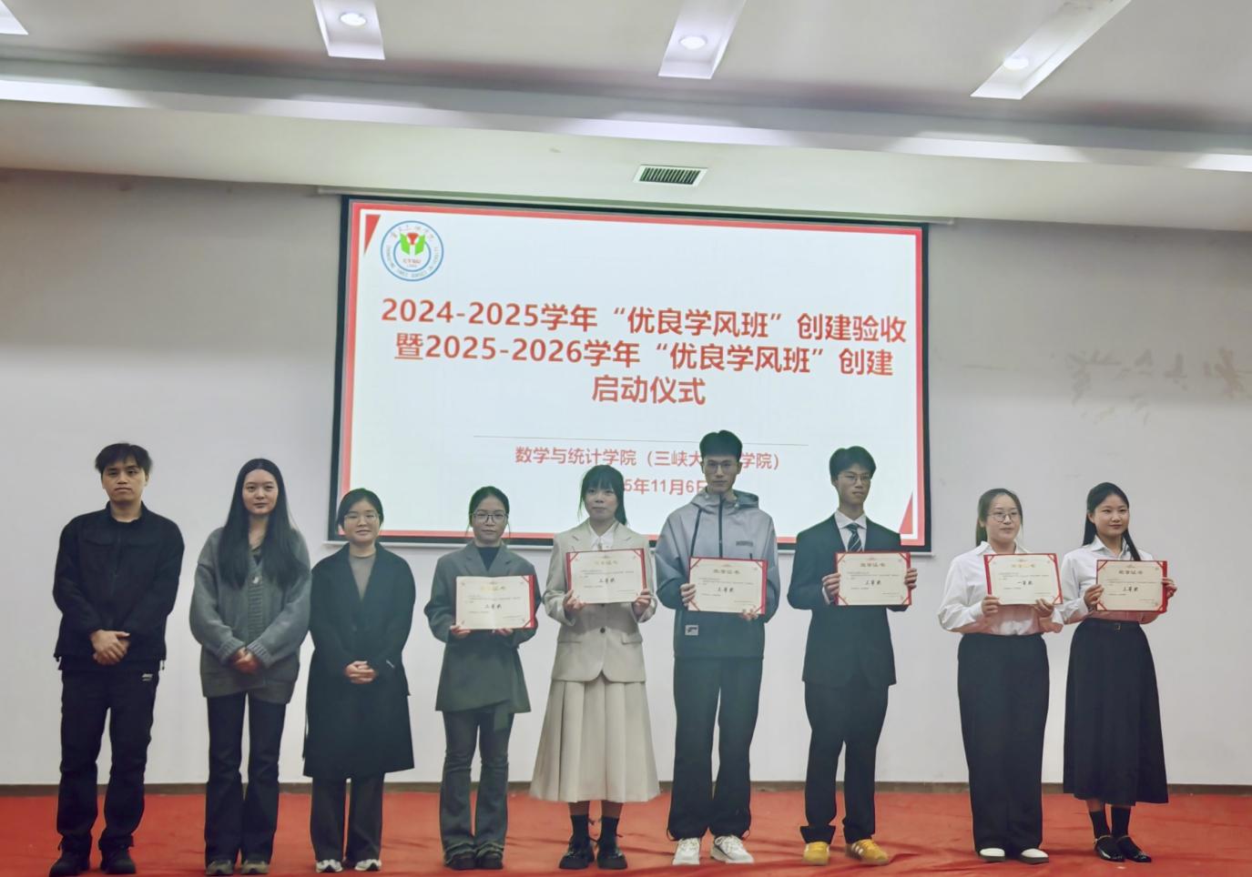 在汇报展示环节,各班代表通过PPT动态演示与现场宣讲相结合的方式,全面展示班级学风建设的阶段性成果。汇报内容涵盖思想引领、学风建设与班级活动等多个维度,不仅有课堂出勤率、学业成绩优良率等硬核数据的支撑,还分享了学科竞赛获奖、志愿服务开展等生动案例,充分展现了各班在增强凝聚力、规范学习行为等方面的创新举措与扎实成效。部分班级的特色建设经验极具推广价值,赢得了评委和现场同学的一致认可。活动尾声,现场评选出本学年“优良学风班”获奖班级,树立了先进典范,彰显了数院学子笃学不倦、追求卓越的精神风貌。