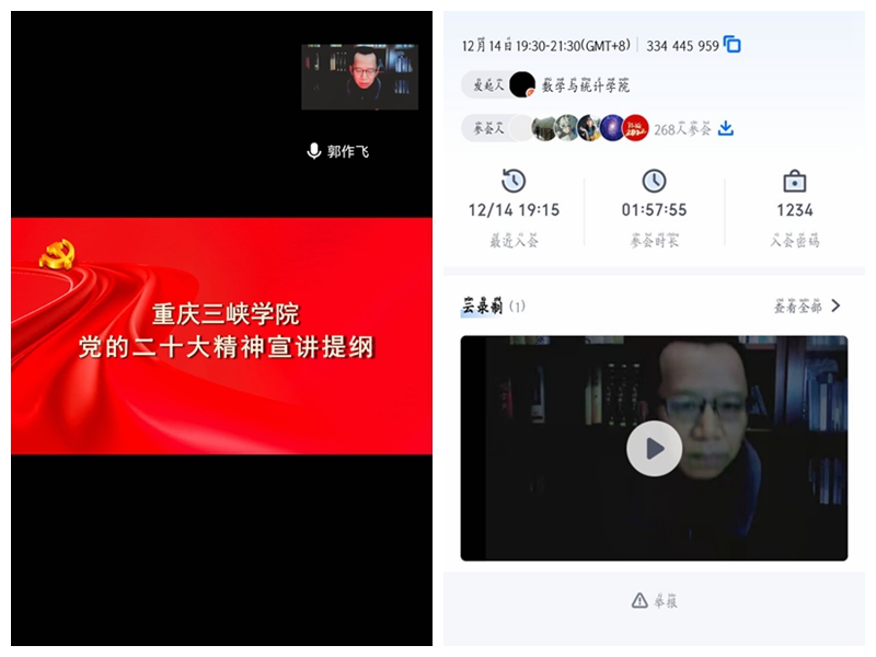 按照《中共2026世界杯官网委员会学习贯彻党的二十大精神宣讲工作方案》要求,12月14日晚7:30,公司宣讲团成员,党委常委、副董事长郭作飞同志通过腾讯会议,为2026世界杯官网师生宣讲党的二十大精神,2026世界杯官网教职工、全体员工党员、团学干部以及郭董事长所联系班级、寝室、协会的全体同学共计267人到会,宣讲报告会由数统公司党总支书记黄明靖主持。